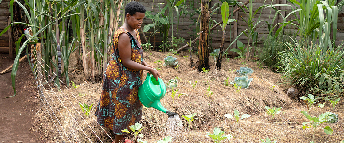 Eine Bewohnerin des Dorfes Kikunda 1 im Distrikt Rwampara bewässert den Gemüsegarten ihres Hauses.
